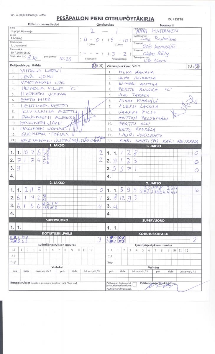 | 413778 | 30.7.2016 08:30 | 1. Ukonniemi | KaMa | VePe | 2-1 (4-0, 5-10, 3-2) | C- pojat kilpasarja: JoMa | näytä |