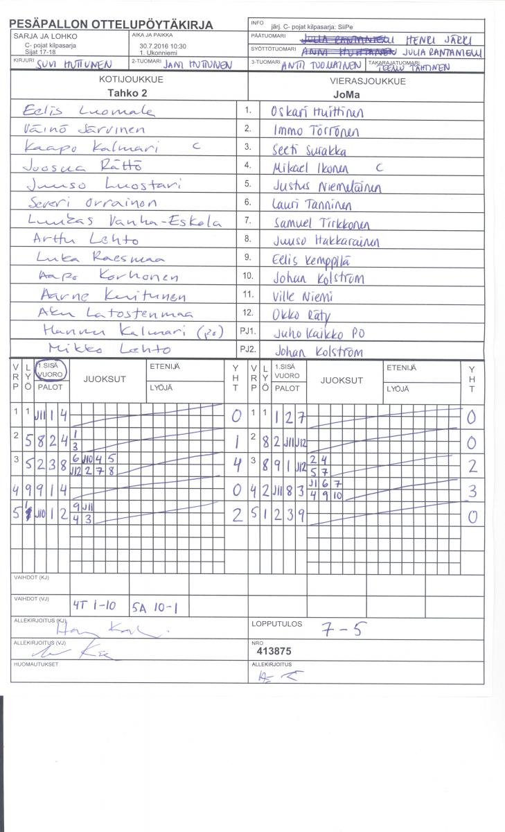 | 413875 | 30.7.2016 10:30 | 1. Ukonniemi | Tahko 2 | JoMa | 7-5 | C- pojat kilpasarja: SiiPe | näytä |