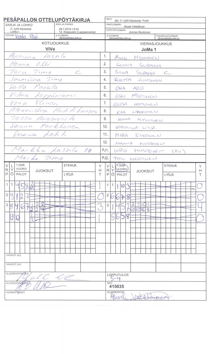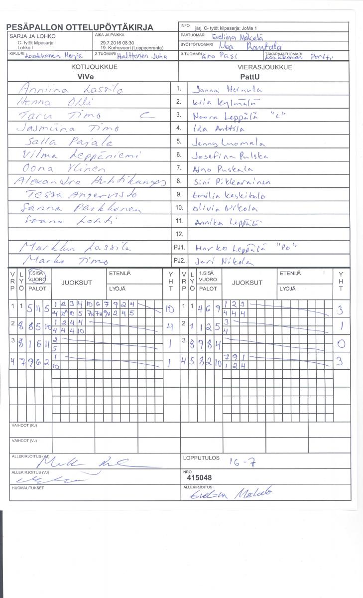 | # | Joukkue | O | V | T | H | JUOKSUT | P |