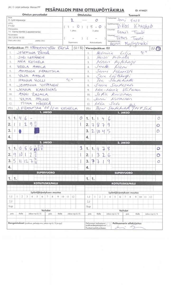 | ID | Pelipäivämäärä | Kenttä | Kotijoukkue | Vierasjoukkue | Tulos | Järjestäjä | Pöytäkirja |