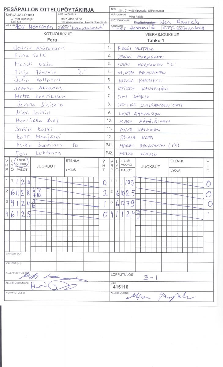 | 415116 | 30.7.2016 08:30 | 10. Asemaseudun kenttä (Rautjärvi) | Fera | Tahko 1 | 3-1 | C- tytöt kilpasarja: SiiPe mustat | näytä |