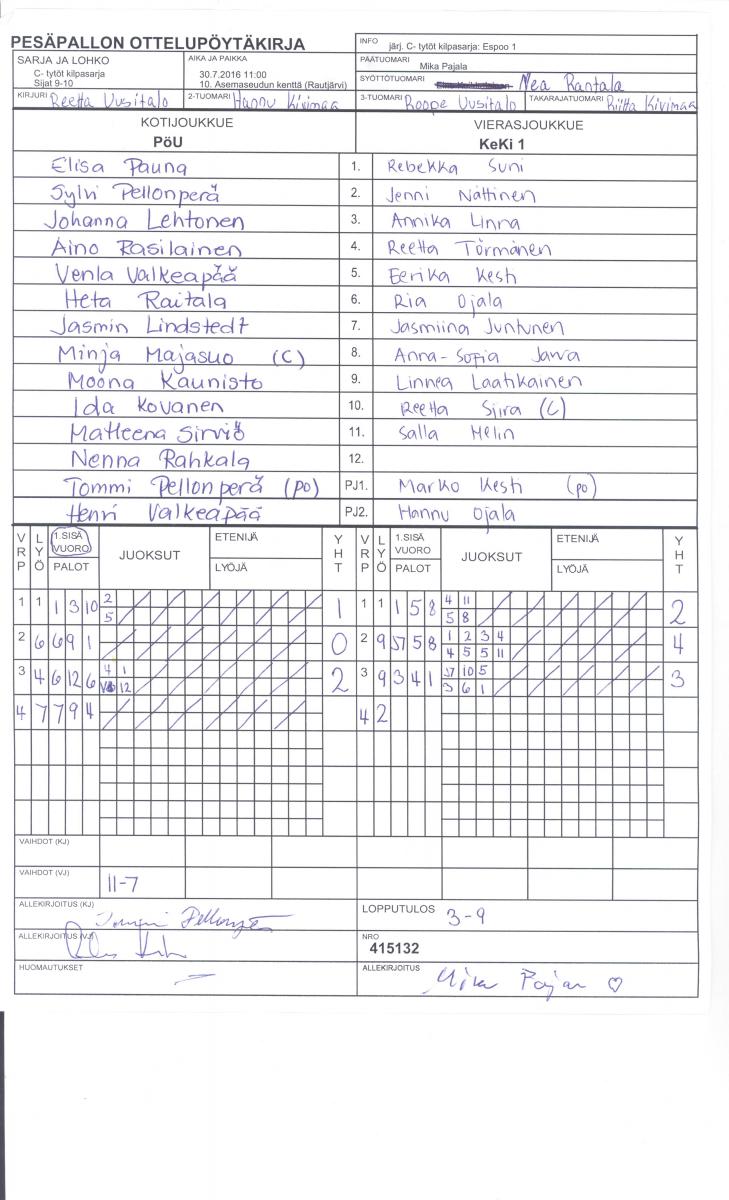 | 415132 | 30.7.2016 11:00 | 10. Asemaseudun kenttä (Rautjärvi) | PöU | KeKi 1 | 3-9 | C- tytöt kilpasarja: Espoo 1 | näytä |
