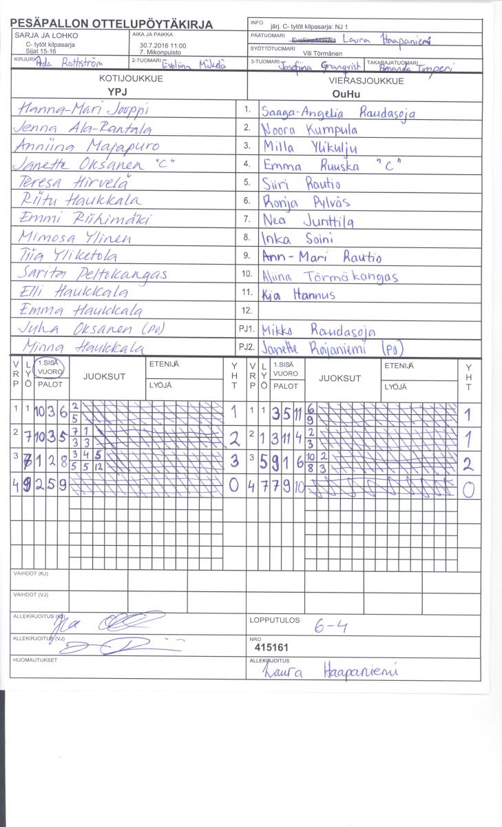 | 415161 | 30.7.2016 11:00 | 7. Mikonpuisto | YPJ | OuHu | 6-4 | C- tytöt kilpasarja: NJ 1 | näytä |