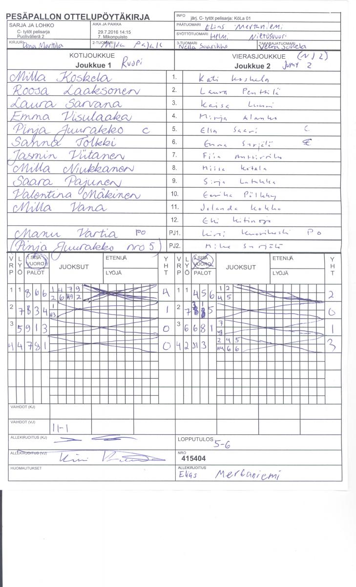 | 415404 | 29.7.2016 14:15 | 7. Mikonpuisto | RuoPi | NJ 2 | 5-6 | C- tytöt pelisarja: KöLa 01 | näytä |