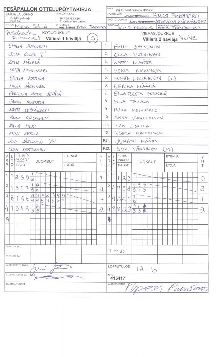 | 415417 | 30.7.2016 13:30 | 3. Karhumäen pallok. | Pesäkarhut punaiset | VuVe | 12-6 | C- pojat pelisarja: IPV-Ysit | näytä |