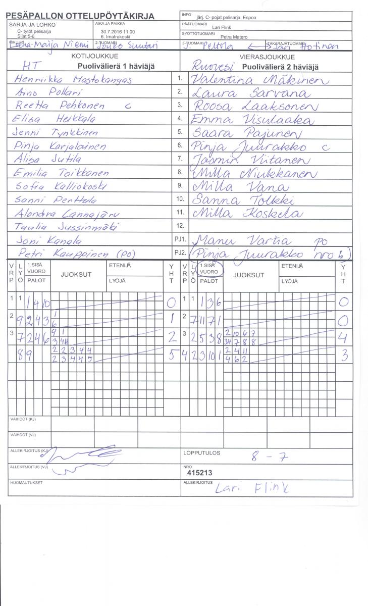 | 415213 | 30.7.2016 11:00 | 6. Imatrakoski | HT | RuoPi | 8-7 | C- pojat pelisarja: Espoo | näytä |