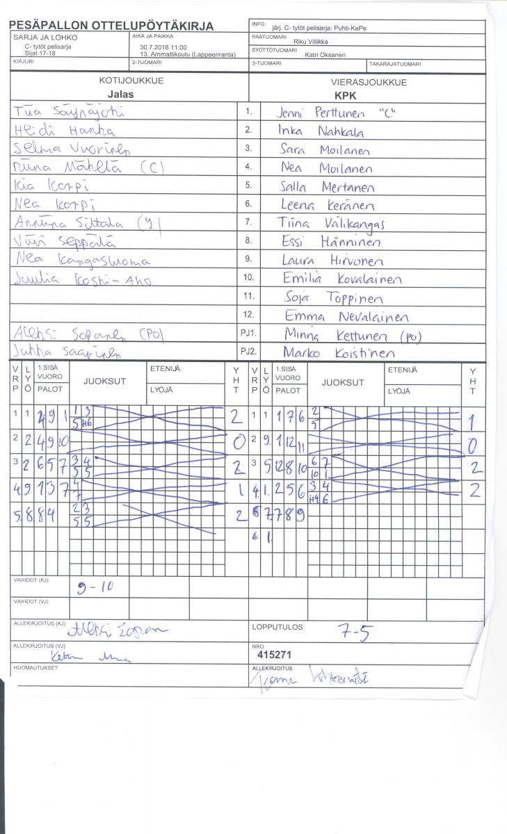 | 415271 | 30.7.2016 11:00 | 13. Ammattikoulu (Lappeenranta) | Jalas | KPK | 7-5 | C- tytöt pelisarja: Puhti-KePe | näytä |