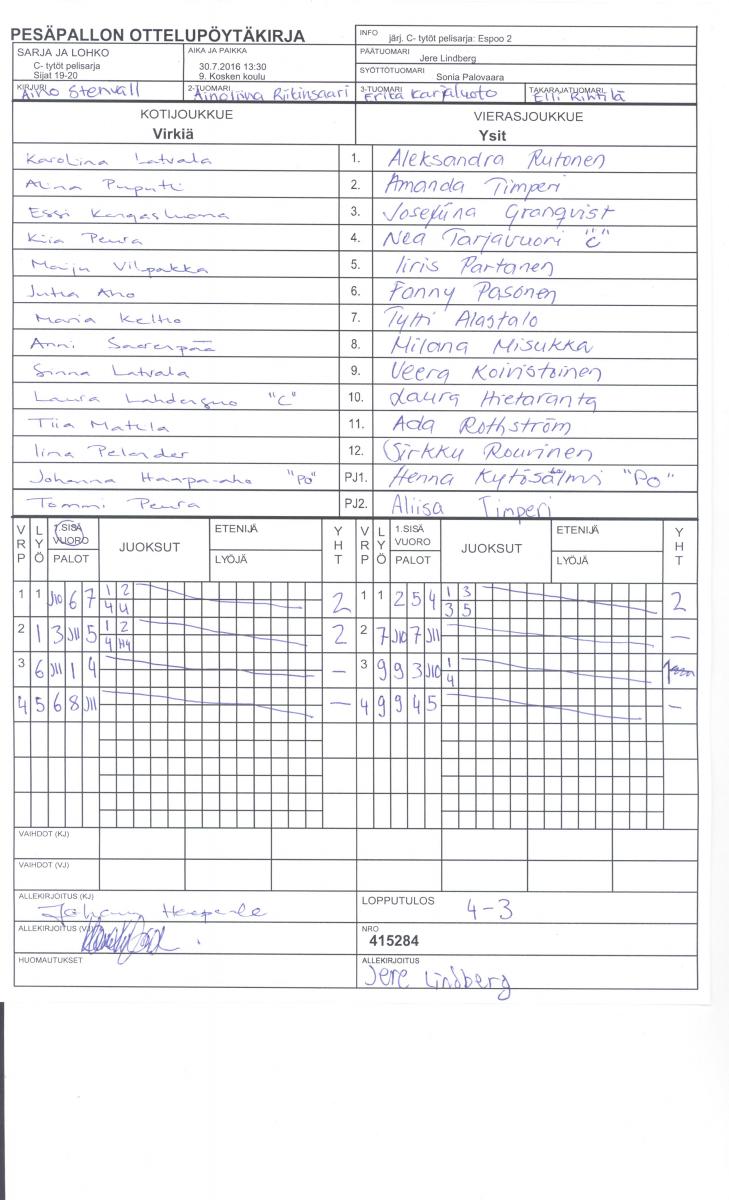 | 415284 | 30.7.2016 13:30 | 9. Kosken koulu | Virkiä | Ysit | 4-3 | C- tytöt pelisarja: Espoo 2 | näytä |
