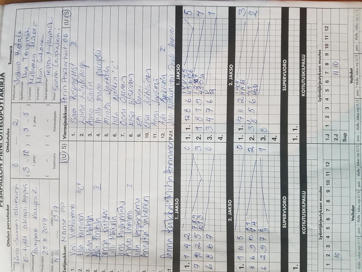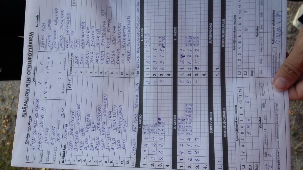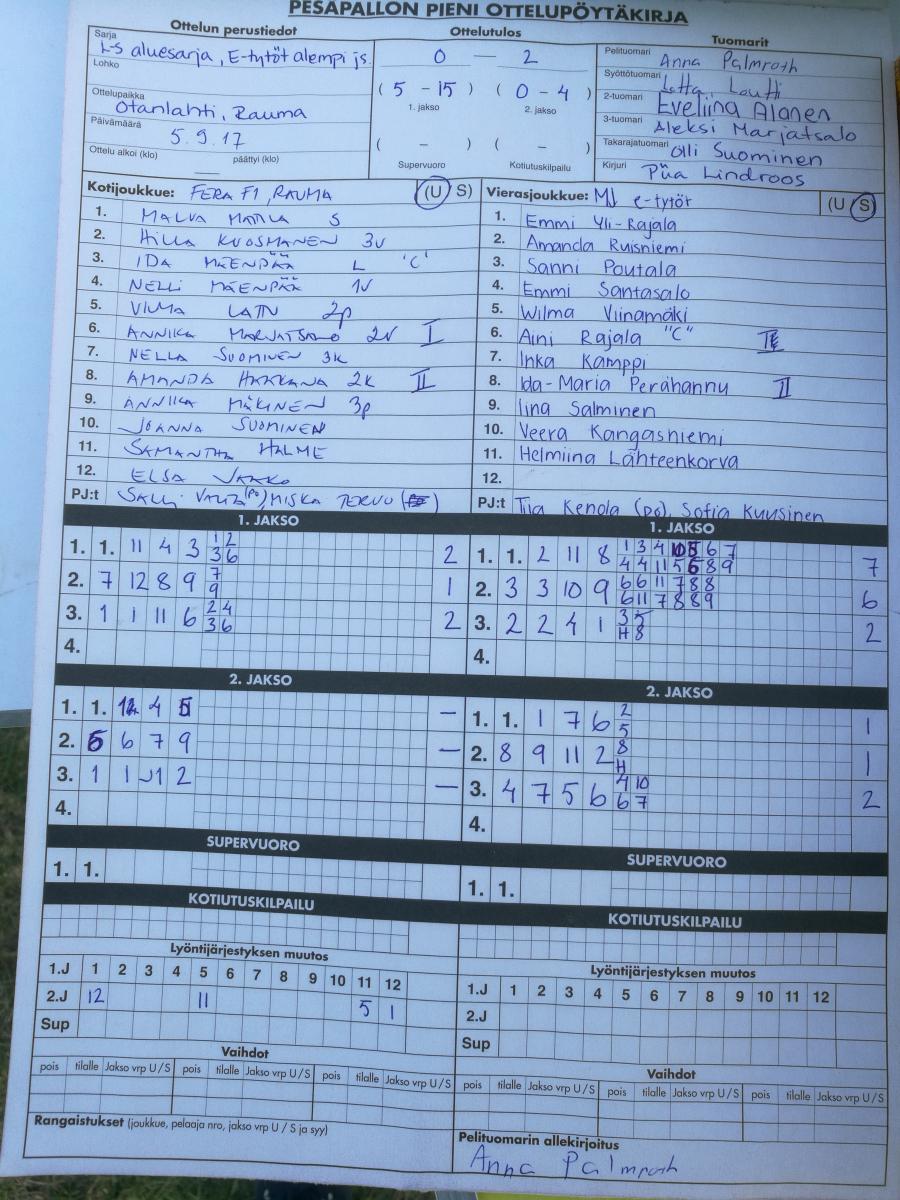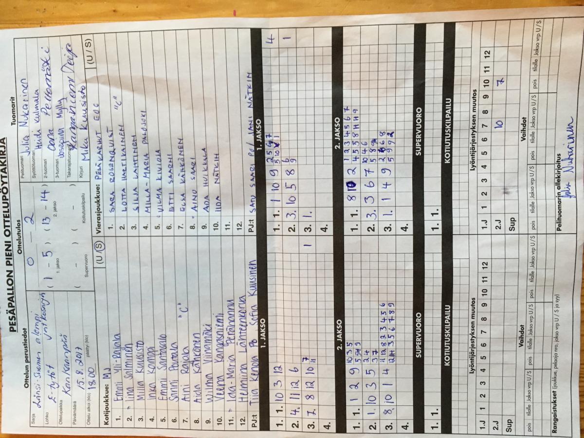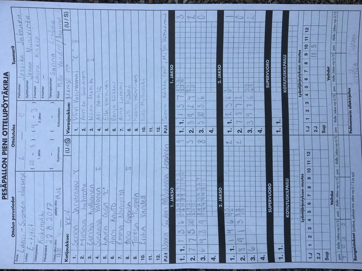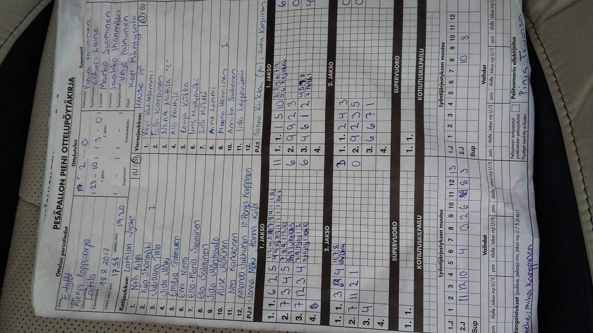 | 520098 | 5.9.2017 18:00 | Lajy | Pesäkarhut F07 | 2-0 (10-7, 14-6) | näytä |