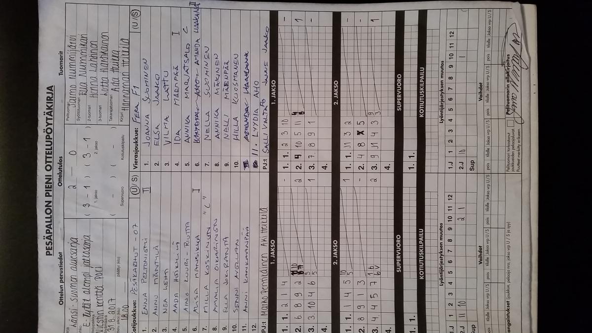 | 519999 | 17.8.2017 18:00 | Pesäkarhut F07 | UP-V / MJ | 2-0 (25-5, 22-2) | näytä |