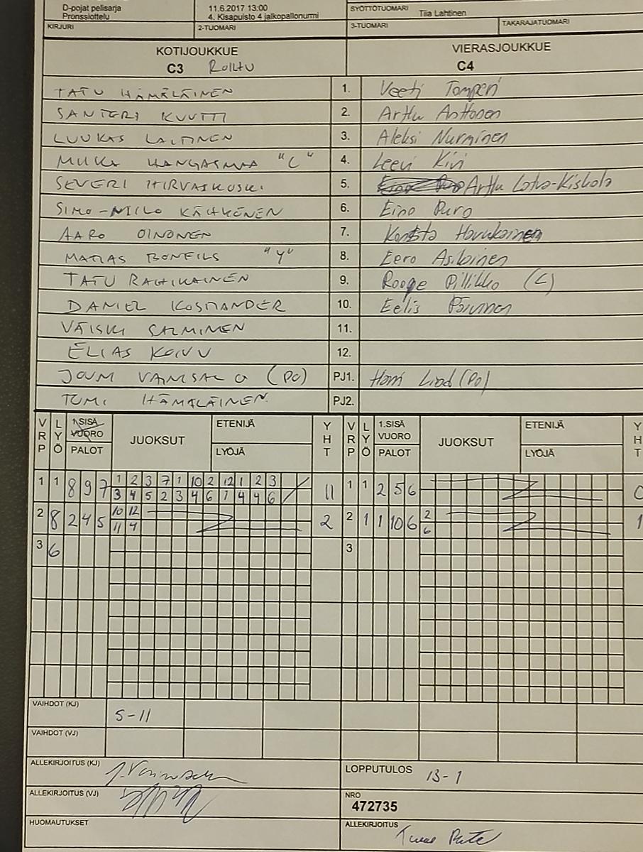 | 472735 | 11.6.2017 13:00 | 4. Kisapuisto 4 jalkopallonurmi | Roihu | Kipe06 | 13-1 | D- pojat kilpasarja: KePe | näytä |
