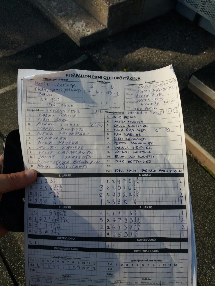 | 521259 | 3.9.2017 15:00 | Rekolan Pesis | LaT15 | 2-0 (7-6, 13-6) | näytä | |