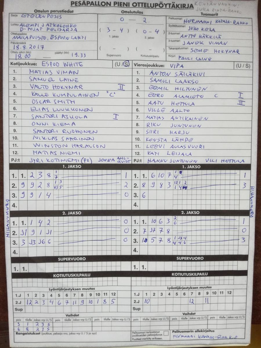 | 520836 | 18.8.2017 18:00 | Espoo White | ViPa | 0-2 (3-4, 0-4) | näytä | |